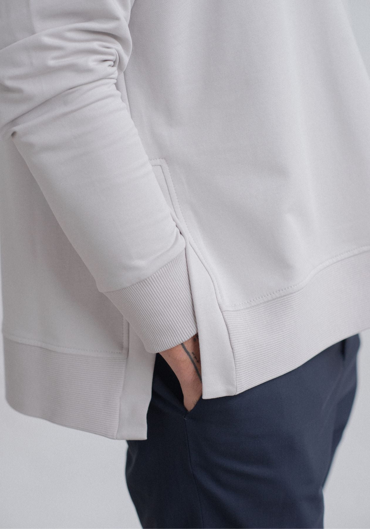 Men Sweatshirt zip-up organic cotton with side slits - Loose fit. Men's high-quality hoodie without a hood, which is incredibly soft and comfortable on the body thanks to the 95% organic cotton material. The relaxed but precisely crafted cut of the sweatshirt ensures a feeling of perfect comfort all year round and is the basis of many outfits. Made sustainably and precisely in EU.