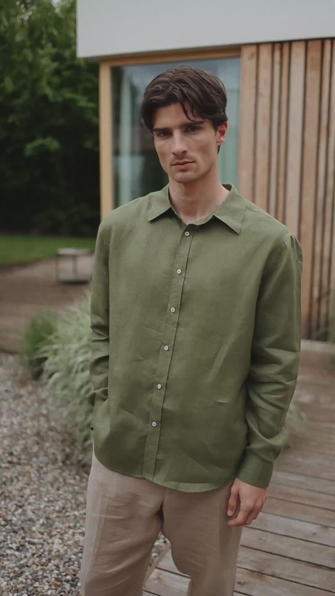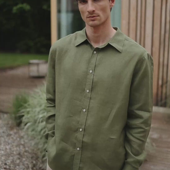 Koszula lniana męska z kołnierzykiem - Moss green