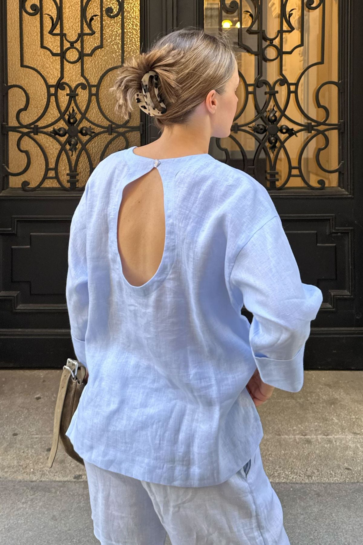 Dámský lněný top open back Light blue (Velikost)